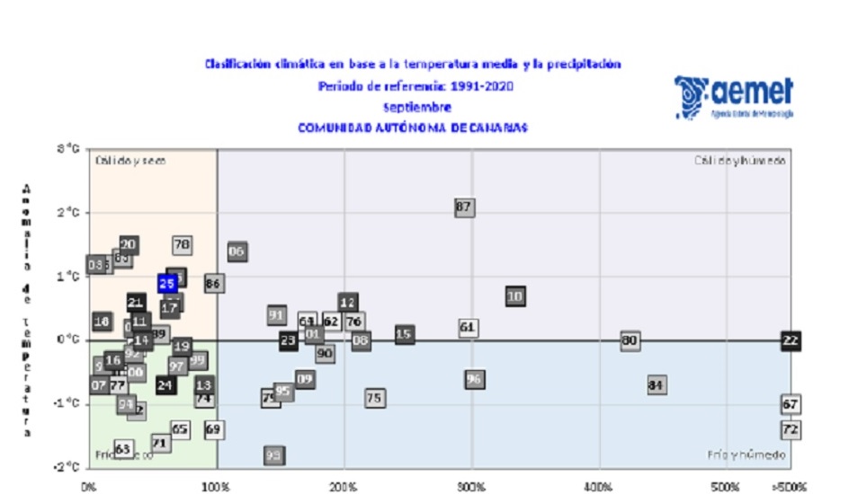 Canarias ha registrado el noveno más de septiembre más cálido de la historia con una media de 22,7ºC, lo que le da el carácter de mes 'muy cálido', con una anomalía térmica de 0,9ºC, según el avance climatológico de la Aemet recogido por DIARIO EL HIERRO. En cuanto a las precipitaciones acumuladas, se contabilizó una media de 3,8 litros por metro cuadrado, el 61% del valor esperado, situándolo como un mes pluviométricamente 'normal', según la serie de referencia 1991-2020, siendo el vigesimosexto más seco desde 1961. En cuanto a las temperaturas mínimas más bajas, estableciendo una segmentación por altitudes a las que están instaladas las estaciones: de 0 a 200 metros, de 201 a 1000 metros, de 1001 a 2000 metros y más de 2000 metros, encontramos los siguientes registros: a) Estaciones situadas entre el nivel del mar y los 200 metros de altitud que hayan registrado temperaturas mínimas iguales o inferiores a los 16,0ºC : Güimar (Tenerife), a una altitud de 115 metros, con una mínima de 15,6 ºC durante el día 27. b) Estaciones instaladas entre los 201 y los 1000 metros de altitud: la mínima registrada fue de 6,5ºC , el día 22, en Ravelo (El Sauzal, Tenerife), a 922 metros. c) Estaciones situadas entre los 1001 y los 2000 metros de altitud: la mínima fue de 4,6ºC en Vilaflor (Tenerife), a 1833 metros de altitud, el día 25. d) Estaciones emplazadas por encima de los 2000 metros: la temperatura más baja que se registró fue de 3,0ºC en Izaña (Tenerife) a 2369 m el día 8. El mes comenzó con marcada situación anticiclónica y temperaturas en valores ligeramente inferiores a la media de referencia, registrándose pocos cambios entre los días 1 y 4. A partir del día 5, la aproximación de una onda del este, con establecimiento de flujo de componente sur a niveles medios y altos, provocó el inicio de un episodio cálido, que llegó a su punto álgido durante los días 7 y 8, con una anomalía térmica, durante esos días, próxima a los + 2,0ºC. Durante el episodio se produjo intrusión de polvo, si bien afectó principalmente a niveles altos. Por otro lado, aunque disminuyó la altitud de la capa húmeda, ésta se mantuvo en niveles suficientemente elevados, como para que no se produjesen ascensos significativos en zonas litorales y medianías bajas de las vertientes norte. El reforzamiento de los alisios, a partir del día 9, provocó un descenso de las temperaturas hasta valores inferiores a la media de referencia, manteniéndose esta situación hasta el día 12. Entre los días 13 al 15 comenzó un nuevo ascenso térmico, a medida que la dorsal africana fue situándose sobre el archipiélago y que el anticiclón atlántico fue desplazándose hacia el este, hasta situarse al oeste de la Península Ibérica, comenzando a inducir flujo de componente este sobre Canarias, sumándose al flujo de componente sur, a niveles medios y altos, generado por la dorsal africana. Esta situación dio lugar a un intenso episodio cálido, que se extendió entre los días 13 y 20, llegando a sus valores máximos los días 18 y 19, y al que siguió un rápido descenso de temperaturas, a partir del día 21. Parte el episodio cálido cumplió los criterios de “ola de calor”, tal y como se detalla en el párrafo siguiente. Durante el día 16, debido a la acción de un vórtice situado en latitudes próximas a Mauritania, se produjo un aumento del flujo de componente sur, a niveles medios y altos. Este flujo también hizo llegar a las islas nubosidad media y alta, que provocó chubascos tormentosos en algunos puntos. Al mismo tiempo, la progresiva reducción del gradiente de presión sobre el archipiélago, unido a las condiciones descritas en el párrafo anterior, intensificaron el episodio cálido hasta poder clasificarlo, entre los días 17 y 20, como “ola de calor”- Aunque durante este episodio no se midieron tantos registros de temperaturas máximas iguales o mayores a 40,0ºC (2, frente a los 6 del episodio de julio y los 21 del de agosto), es decir, no se llegó a alcanzar tantos valores extremos como en los dos episodios anteriores mencionados, este episodio alcanzó mayor extensión (en particular, afectó a zonas litorales de las vertientes norte, debido a la desaparición de los alisios a todos los niveles durante esos días) y mantuvo las temperaturas en valores elevados, de forma estable y persistente, durante todos los días del mismo, afectando también a las mínimas, que mantuvieron valores relativamente elevados. Hay que señalar que se identifican 106 registros de temperaturas máximas iguales o mayores a 40,0 ºC, teniendo en cuenta todos los septiembres desde que se dispone de registros. Asimismo, la intrusión de polvo mineral desértico fue más intensa y extensa que en los casos de julio y agosto, afectando, en este caso, también a niveles bajos y a todas las vertientes. A partir del día 21, el desplazamiento hacia el este de la dorsal africana, alejándose de Canarias, el restablecimiento progresivo del régimen de alisios y el movimiento hacia el centro del atlántico del vórtice cercano a Mauritania, así como la aproximación del extremo sur de una vaguada al norte del archipiélago, generaron las condiciones para el descenso de las temperaturas, las cuales permanecieron en valores iguales o inferiores a la media de referencia desde el día 23 hasta final de mes. PRECIPITACIONES Las precipitaciones fueron, en general, débiles y dispersas, aunque se registraron, de forma local, chubascos de carácter tormentoso, debidos a nubosidad media de componente sur. Los días en los que se registraron precipitaciones fueron los siguientes. Días 1-2: Situación marcadamente anticiclónica, con precipitaciones débiles, concentradas en las vertientes norte de las islas de mayor relieve, debidas a acumulación de nubosidad aportada por el régimen de alisios. Días 8-11, extendiéndose hasta el día 15 en algunas zonas: paso de onda del este, dejando