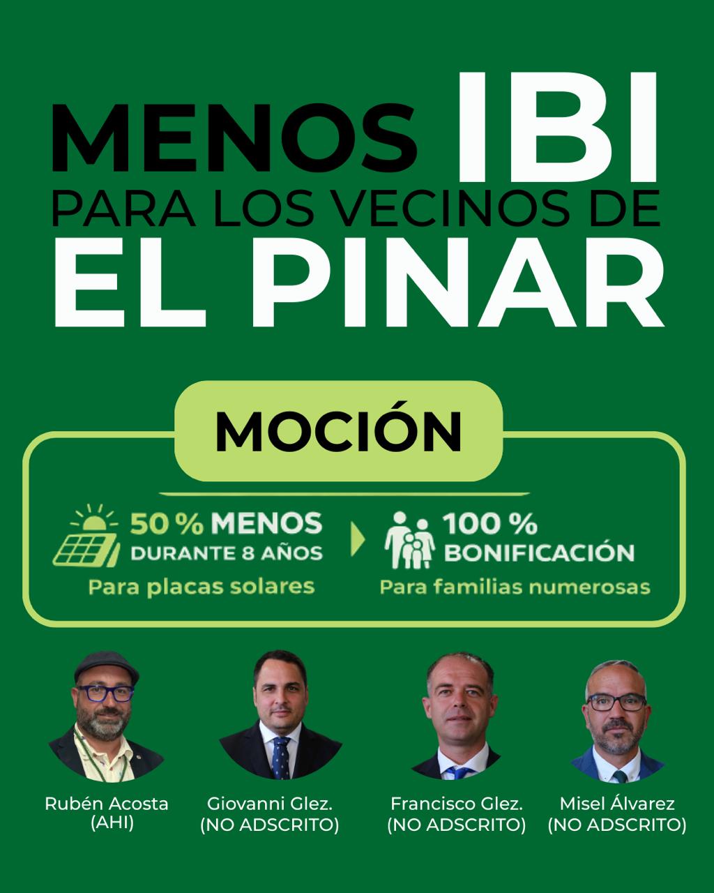 Los concejales Rubén Acosta (AHI), Giovanni González, Misel Álvarez y Francisco González, del grupo de no adscritos, han presentado una moción en el Ayuntamiento de El Pinar para modificar la ordenanza fiscal del IBI e introducir nuevas bonificaciones de carácter social y energético. La iniciativa no plantea ninguna medida extraordinaria ni novedosa, sino la incorporación en El Pinar de bonificaciones que ya están vigentes en los otros municipios de la isla, como Valverde y La Frontera, y en un alto porcentaje de ayuntamientos de Canarias, informa la AHI en una nota. Dos medidas concretas La propuesta incluye: ● Una bonificación del 50 % en el IBI durante ocho años para viviendas que instalen placas fotovoltaicas de autoconsumo. ● Una bonificación del 100 % del IBI para familias numerosas, mientras mantengan dicha condición y siempre que se trate de su vivienda habitual. Ejemplo orientativo ![]() El importe del IBI varía según el valor catastral de cada inmueble, pero para explicar el impacto de la medida, los concejales ponen un ejemplo práctico: Así, ponen como ejemplo, que, si una vivienda paga 350 euros anuales de IBI, con la bonificación por autoconsumo pasaría a pagar 175 euros. Eso supondría un ahorro de 175 euros al año durante ocho ejercicios. En el caso de las familias numerosas, una vivienda con ese mismo importe dejaría de pagar el impuesto mientras mantenga dicha condición. Igualdad entre vecinos de la isla Los concejales señalan que el objetivo es claro: “que los vecinos de El Pinar tengan las mismas oportunidades fiscales que el resto de vecinos de El Hierro”.- “Estas bonificaciones ya existen en Valverde y La Frontera. No hablamos de privilegios, sino de igualdad y de actualizar nuestra ordenanza a medidas que ya funcionan en otros municipios", concluyen. |