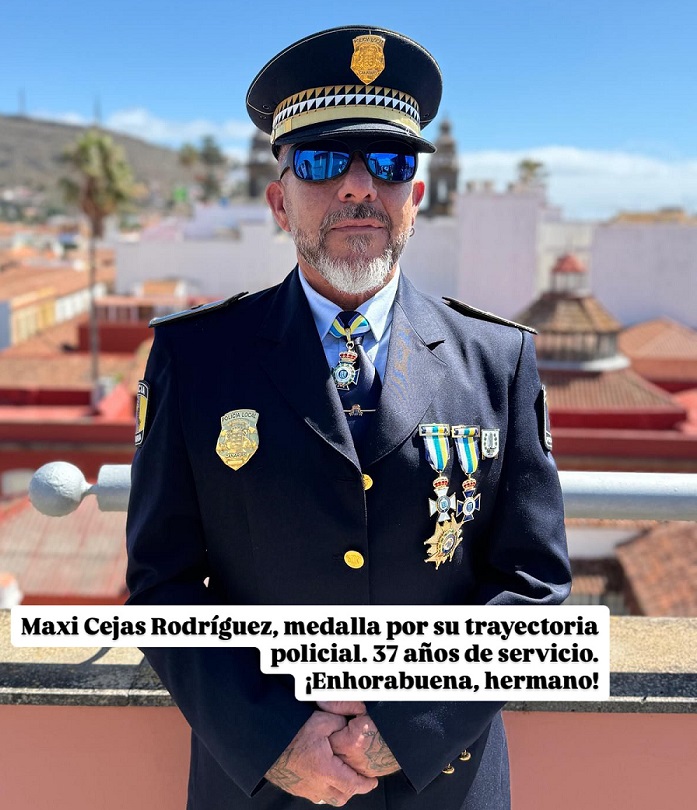 El policía herreño, Maxi Cejas Rodríguez, recibe una medalla por su trayectoria policial. 37 años de servicio. |