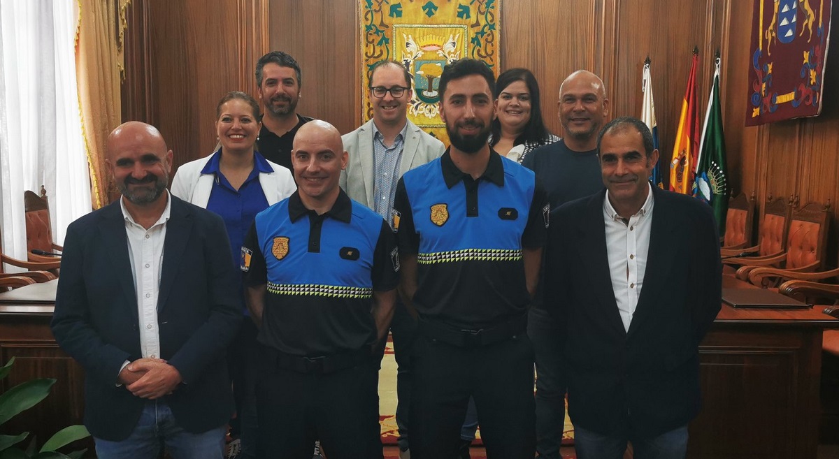 El Ayuntamiento de Valverde ha acogido esta mañana la toma de posesión de los dos nuevos agentes para la Policía Local, Germán R. M y Yefren D. P., han prometido su cargo en una ceremonia celebrada en el salón de plenos, siendo los primeros agentes que se incorporan a este cuerpo en 19 años. Tras haber superado unas oposiciones donde participaron 64 ciudadanos, los nuevos agentes próximamente iniciarán su formación en la academia de la Dirección General de Seguridad y Emergencias del Gobierno de Canarias, para posteriormente culminar con el período de prácticas de servicio efectivo. Con este proceso, se satisface una importante demanda vecinal, ampliando la actual plantilla a 3 agentes, reforzando este cuerpo de fuerza pública de seguridad de naturaleza civil que opera bajo la autoridad y dependencia del alcalde. El alcalde Antonio Chinea y el resto de ediles presentes, han dado la bienvenida a sus nuevos compañeros, deseándoles una “fructífera y larga carrera en nuestro municipio, donde se convertirán en un eslabón fundamental en la seguridad y tranquilidad diaria de nuestros vecinos". |